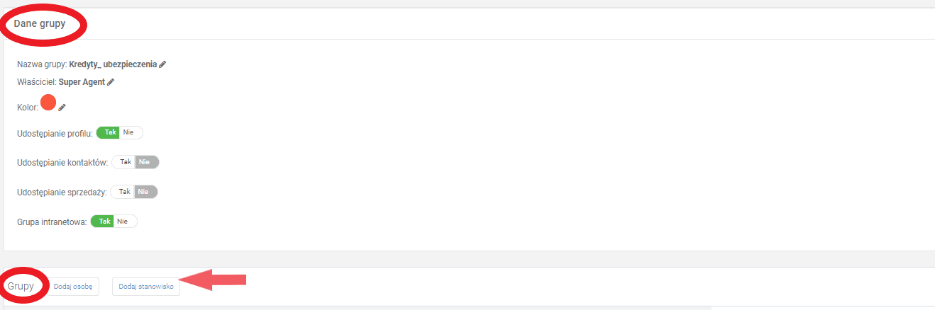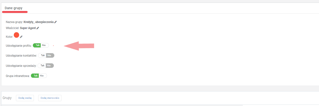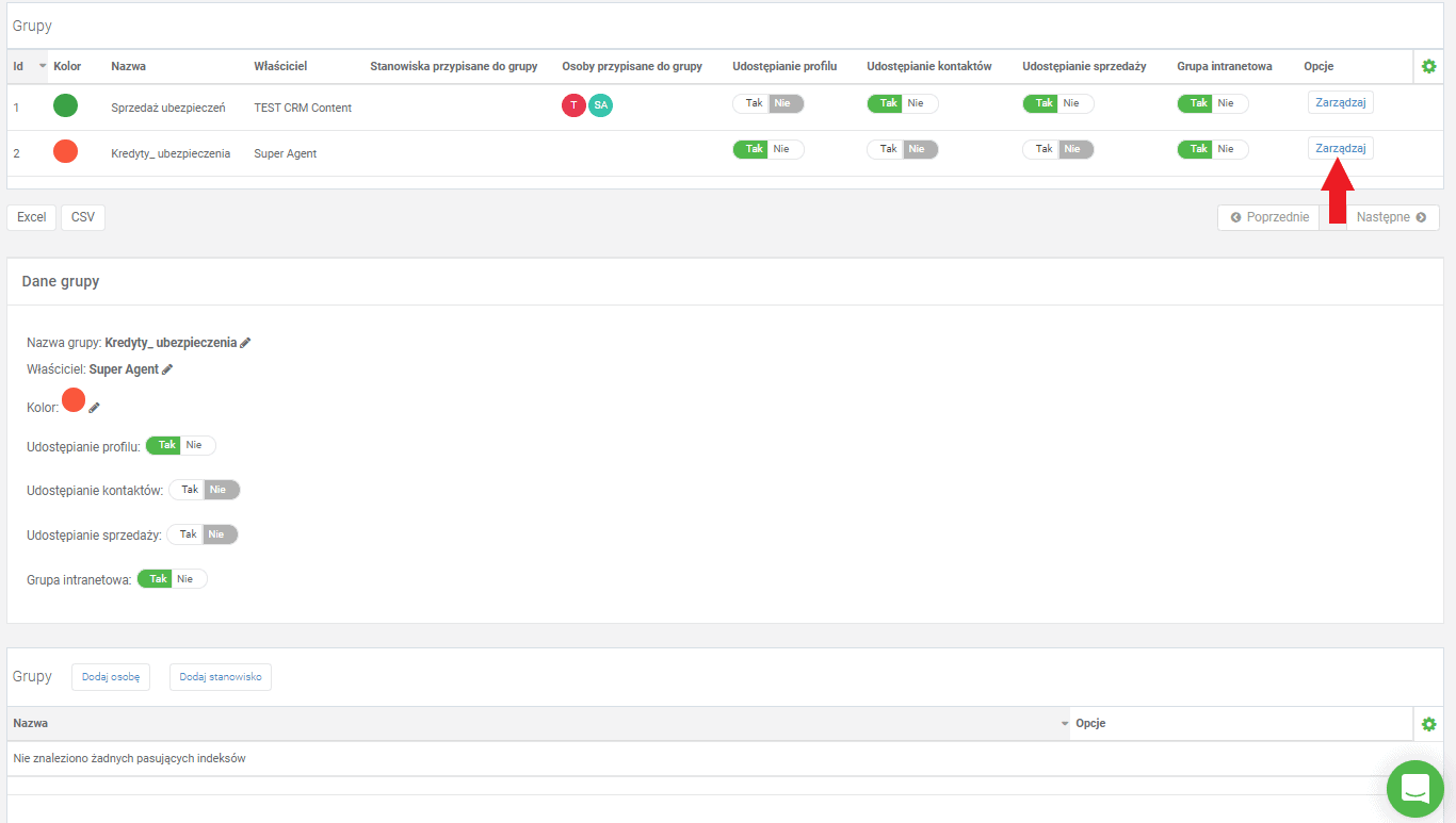 Następnie klikamy Zarządzaj 3. Przechodzimy do konfigurowania danej grupy. W punkcie tym dobieramy członków może to być określone kryterium, np. osoba odpowiedzialna w oddziale za konkretną sprzedaż bądź według stanowiska – np. kierownik.4. Poprzez kliknięcie przełącznika TAK/NIE zaznaczamy co w danej grupie ma być widoczne.