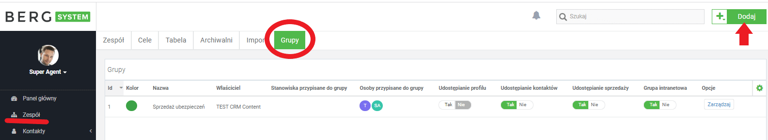 Wchodzimy w Moduł Zespół następnie w zakładkę Grupy i w lewym górnym rogu klikamy Dodaj. I tworzymy nazwę Grupy.