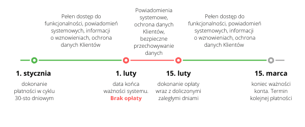 W sytuacji uiszczenia opłaty po terminie ważności systemu, doliczona zostanie kwota za nieopłacony czas. A ważność konta będzie liczona od dnia zapłacenia przez następne 30/365 dnia w zależności od wyboru cyklu płatności