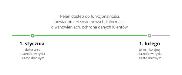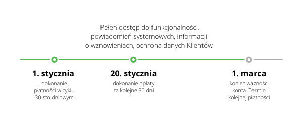 W przypadku opłacenia konta przed datą końca ważności subskrypcji, system przedłuży się o następny okres liczony od daty końca.